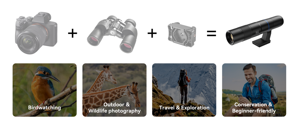 VisionMax replaces your binocular, camera, and tripod adapter in a single compact device.Just power on and start exploring — from a birdwatching trail to a mountain summit.